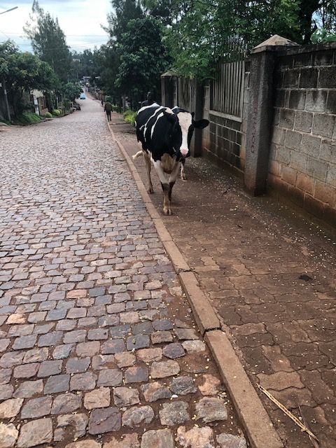 Today I went for a walk to the larger supermarket, which means I get to do a 3 mile walk for exercise. The main street that used to be throbbing with traffic is now largely empty and there is a police presence on most corners. On my road, I see a cow casually strolling towards to me. I’ve seen plenty of cows since I’ve lived here, but none in the middle of Kigali. My landlady later tells me that the cow belongs to the house behind hers, and the cow provides her family’s milk. Sure enough, later that evening I hearing mooing.