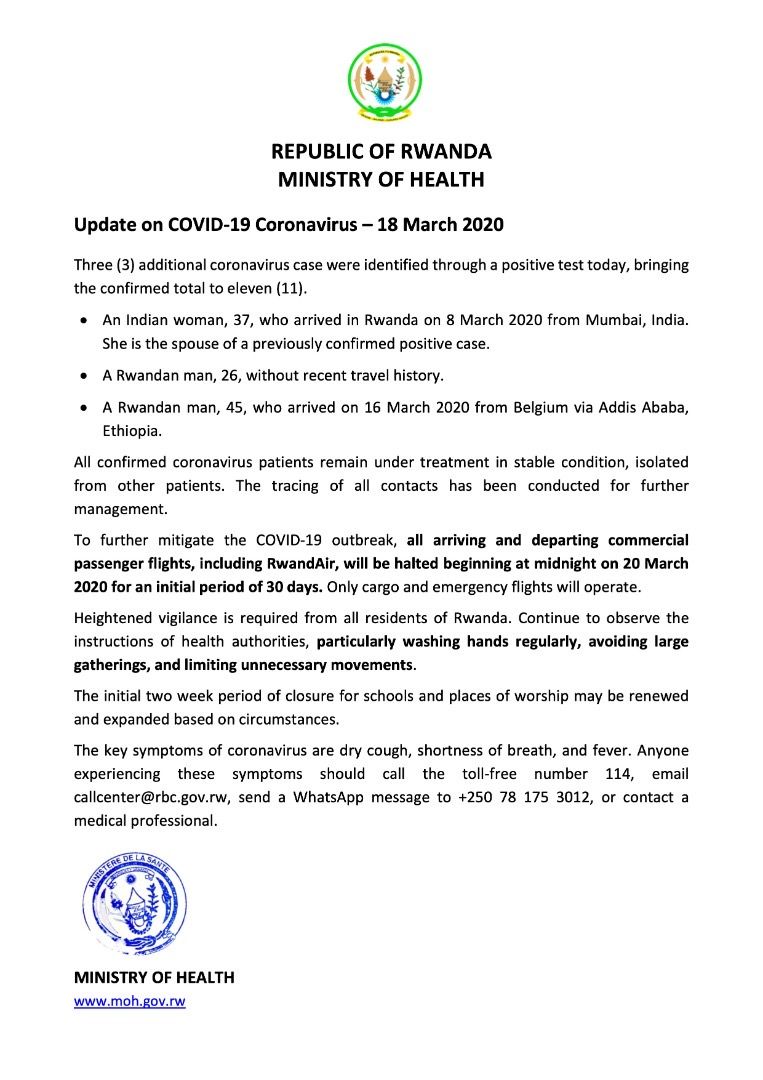 There is also information on the halting of all commercial passenger flights in and out of Rwanda from 20thMarch for an initial period of 30 days.