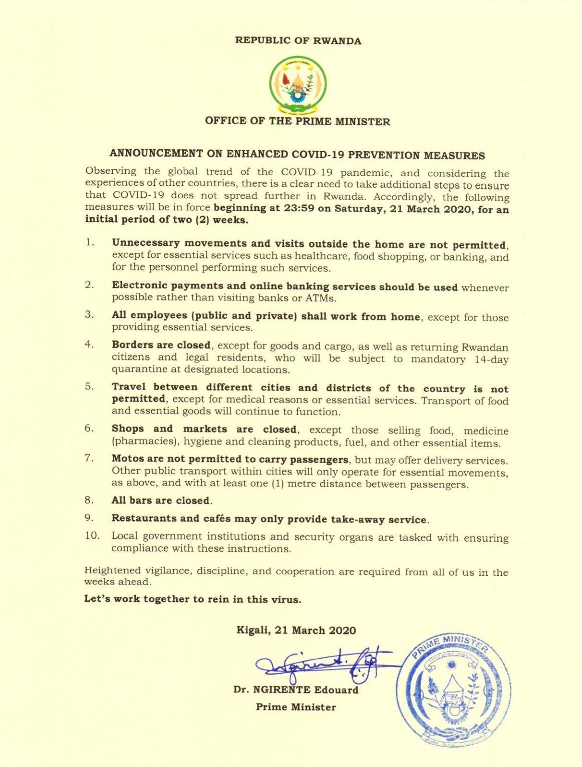 A statement is issued by the Office of the Prime Minister citing further steps in the battle against COVID-19, to be carried out for an initial period of 14 days.