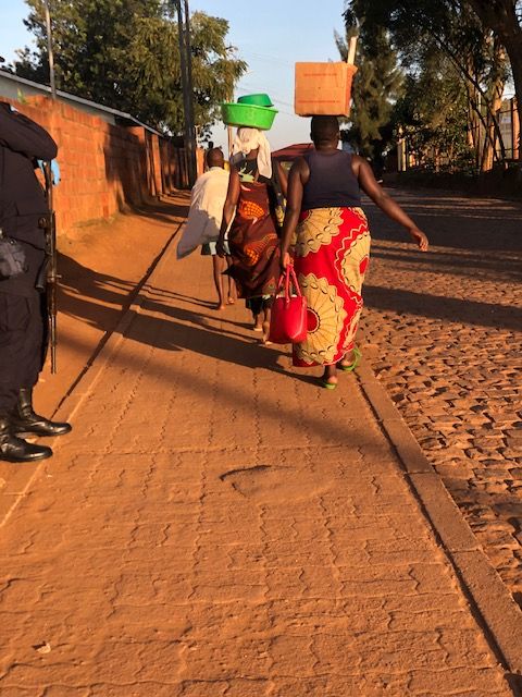 I walk to a larger supermarket and get some food. It’s nice to see people again and I take photos of women carrying their packages on their heads. There is a large police presence and people are asked where they are going.